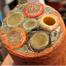 如(rú)左(zuǒ)側的(de)救生(shēng)鐘(zhōng)主(zhǔ)缆(lǎn)是(shì)为國(guó)內(nèi)救生(shēng)鐘(zhōng)提(tí)供,9个(gè)气(qì)管(guǎn)+2組電(diàn)缆(lǎn)信(xìn)号(hào)缆(lǎn)。內(nèi)管(guǎn)最(zuì)大(dà)能(néng)耐3000psi的(de)壓力,電(diàn)缆(lǎn)导體(tǐ)的(de)電(diàn)壓最(zuì)高(gāo)可(kě)达(dá)3000VAC。